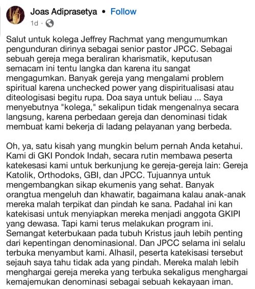 Banyak pihak yang kagum atas keputusan yang diambil oleh Pastor Jeffrey Rachmat, salah satunya dari unggahan Facebook akun Joas Adiprasetya.